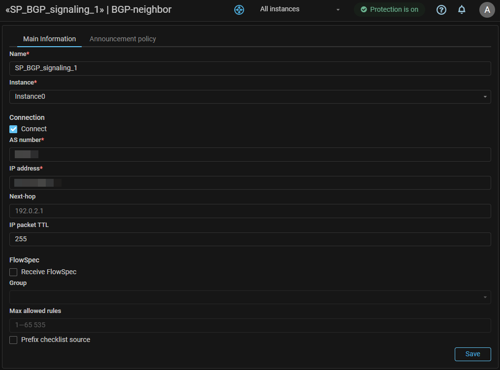 To announce prefixes requiring traffic scrubbing, a BGP session must be configured between the FastPPS instance and the MSSP BGP speaker. The MSSP device is added as a BGP neighbor of the FastPPS instance.
