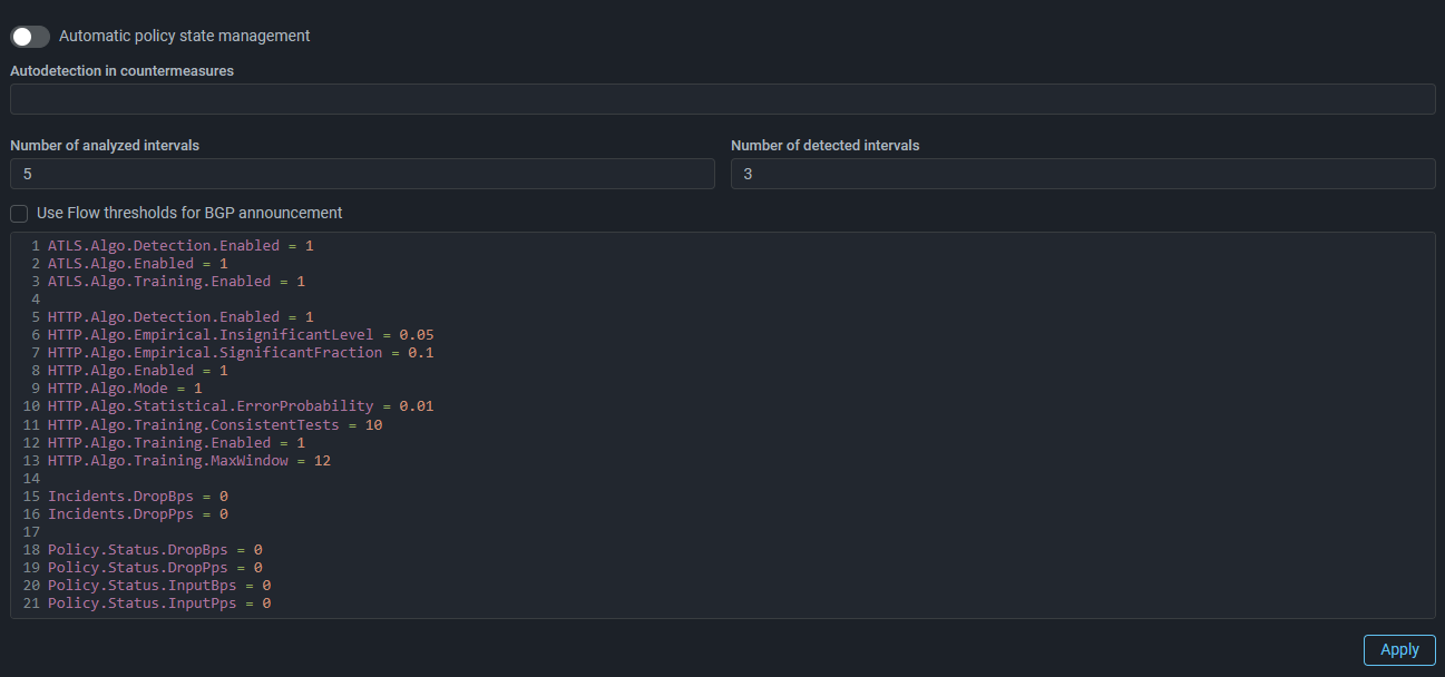 Also, through the web interface within the policy, you can set the autodetection parameters “Number of analyzed intervals” and “Number of detected intervals”, each interval is 5 seconds.