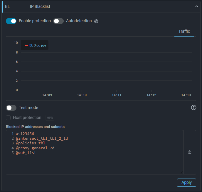BL allows to effectively protect network from various attacks by dropping all traffic coming from specified IP addresses. In addition, it may be convenient to drop traffic based on autonomous system affiliation. For example, if you know that hosting IP addresses should not connect to the protected resources, you can specify the numbers of the corresponding autonomous systems in the list.