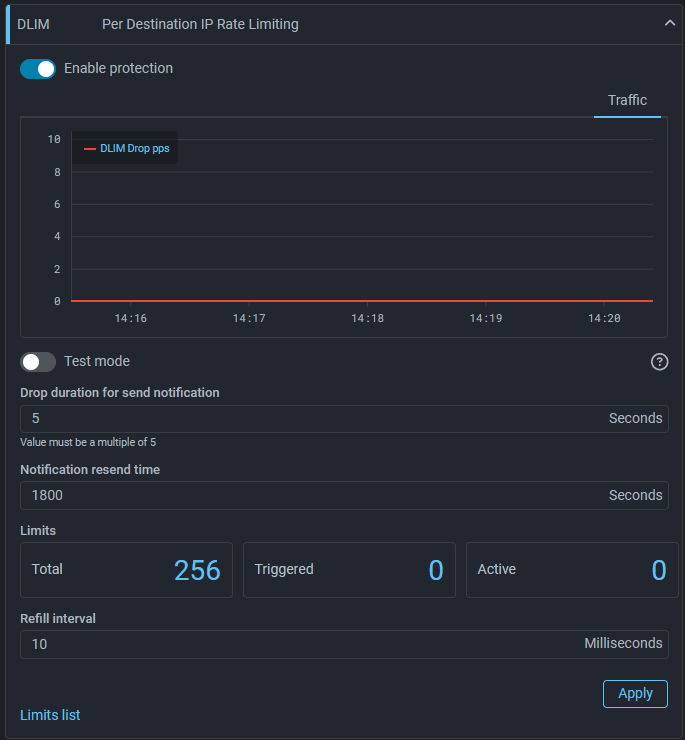 The DLIM countermeasure limits traffic in pps and bps to destination IP address. DLIM processes packets after all filtering in protection policies and is used to save the network behind FastPPS at the cost of partially dropping legitimate traffic towards the victim.