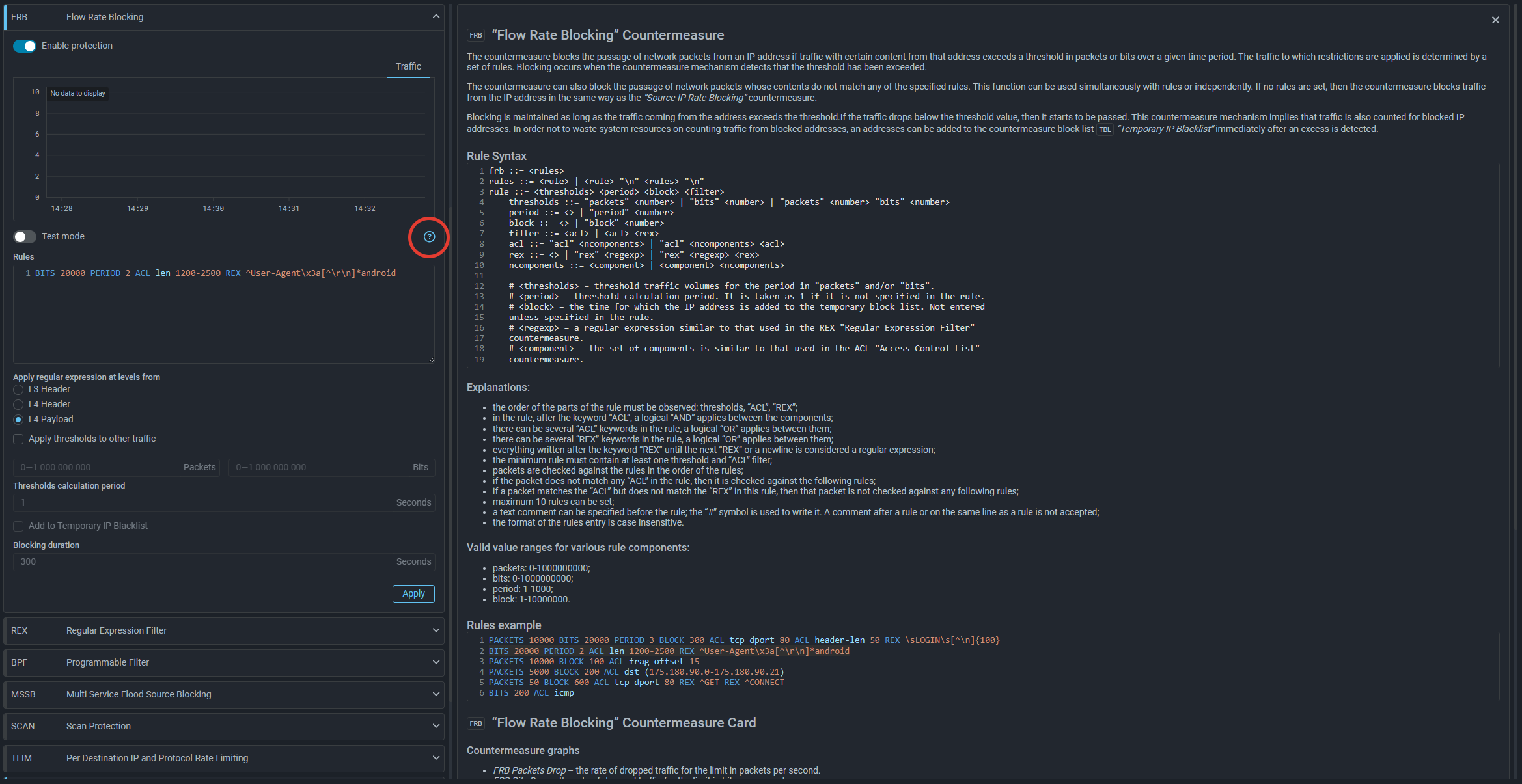 Most countermeasures have a Test mode. In test mode, countermeasures build traffic drop graphs, but in reality, traffic passes through without being dropped or changed. This is useful for assessing the impact of countermeasure settings on legitimate traffic. Therefore, before enabling a countermeasure, you should check the impact of the settings in test mode.