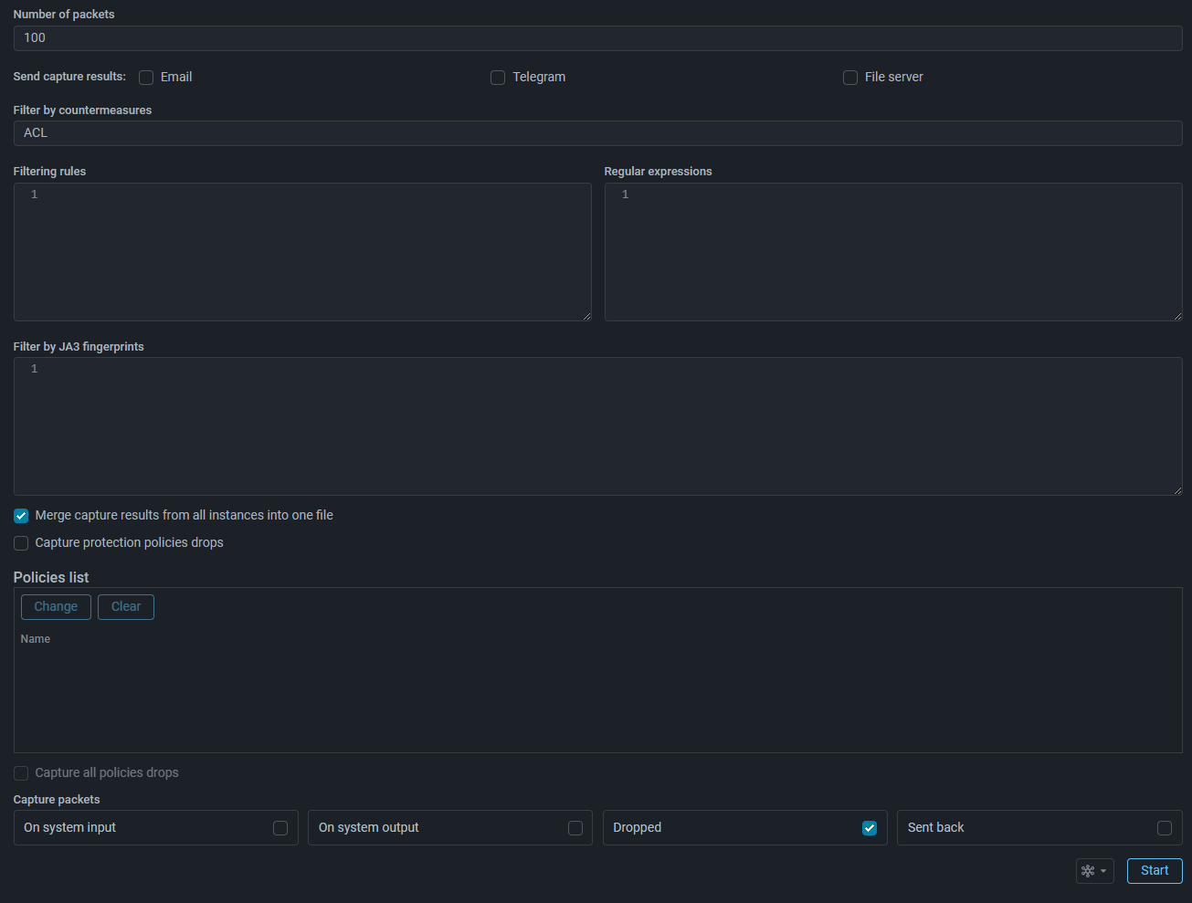 If the ACL drops packets without any attack, then the packet capture panel can help us to capture the packets dropped by the ACL countermeasure and perform fine-tuning.