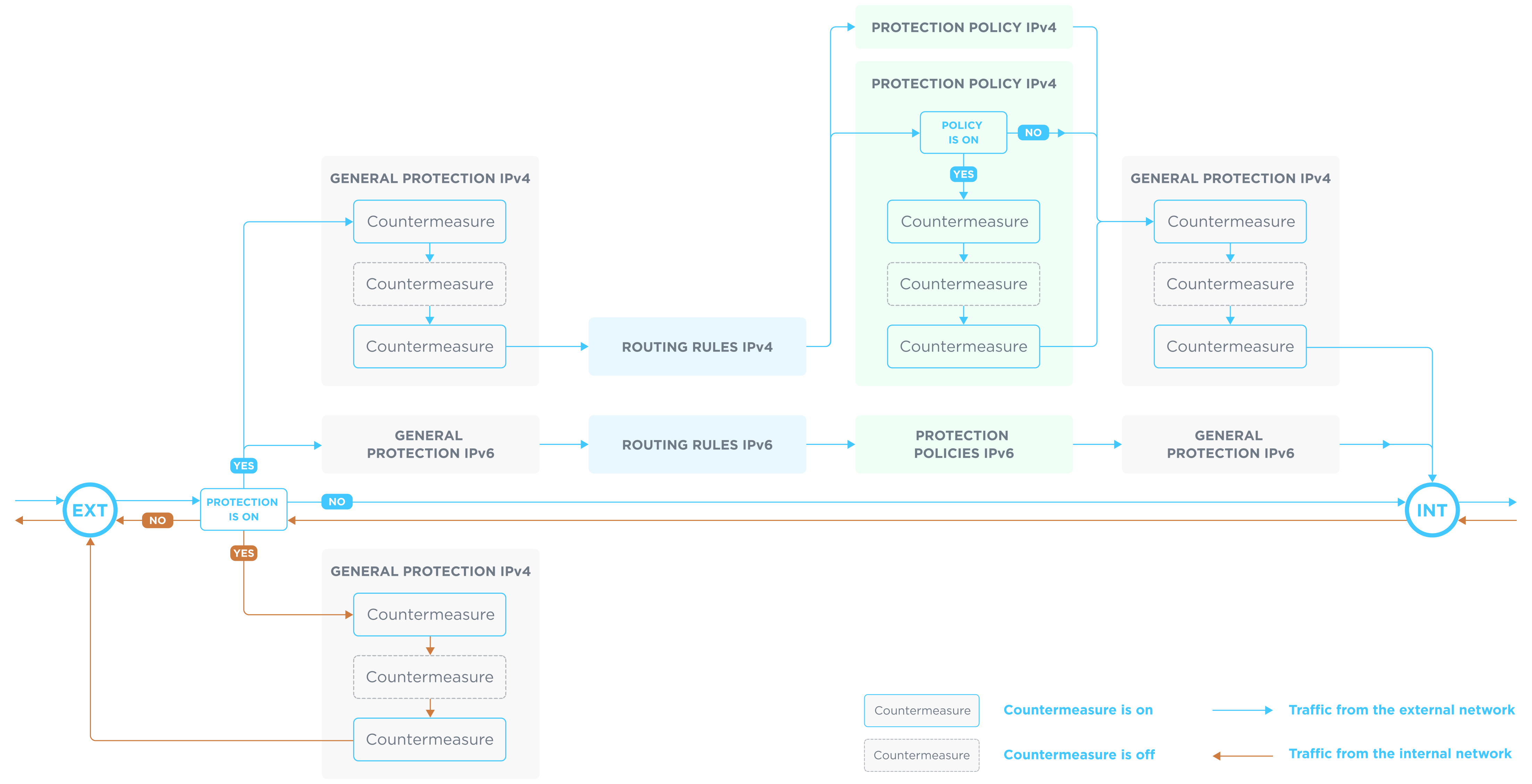 First, all packets are processed in “General Protection”, then 5-tuple routing rules distribute traffic to protection policies, and after the policies, the traffic returns to “General Protection” for the remaining countermeasures.
