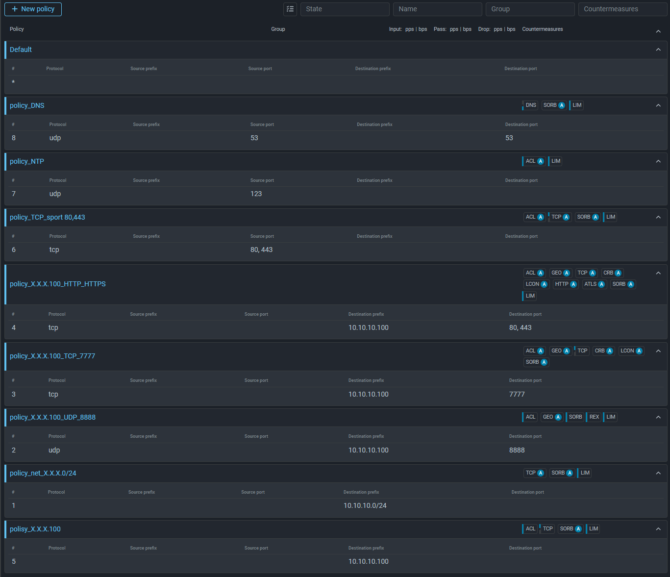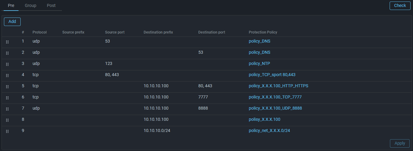 9. dst X.X.X.0/24 -> policy_net_X.X.X.0/24Protection Policies Setup