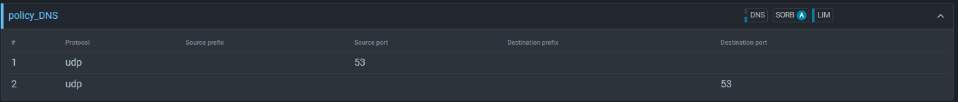 2. udp dport 53 -> policy_DNSWith rules 1 and 2 we directed all DNS traffic of the network into one policy, both requests and responses. In autodetection mode: DNS, SORB. Constantly enabled: LIM.